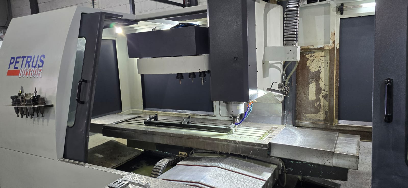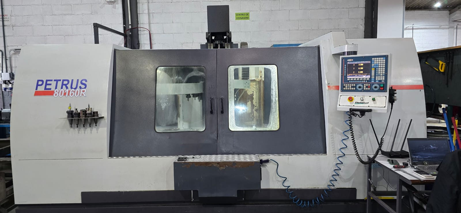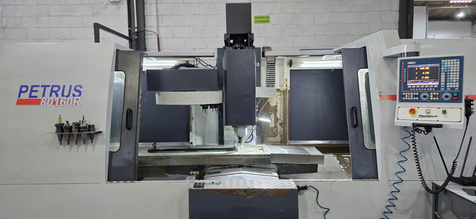Centro de Usinagem Vertical Nardini Diplomat Petrus 80160R, equipamento robusto e de alta precisão, com ampla área de trabalho e excelente capacidade de carga. Ideal para fresamento, furação e usinagem de peças de médio e grande porte em diversos segmentos industriais.