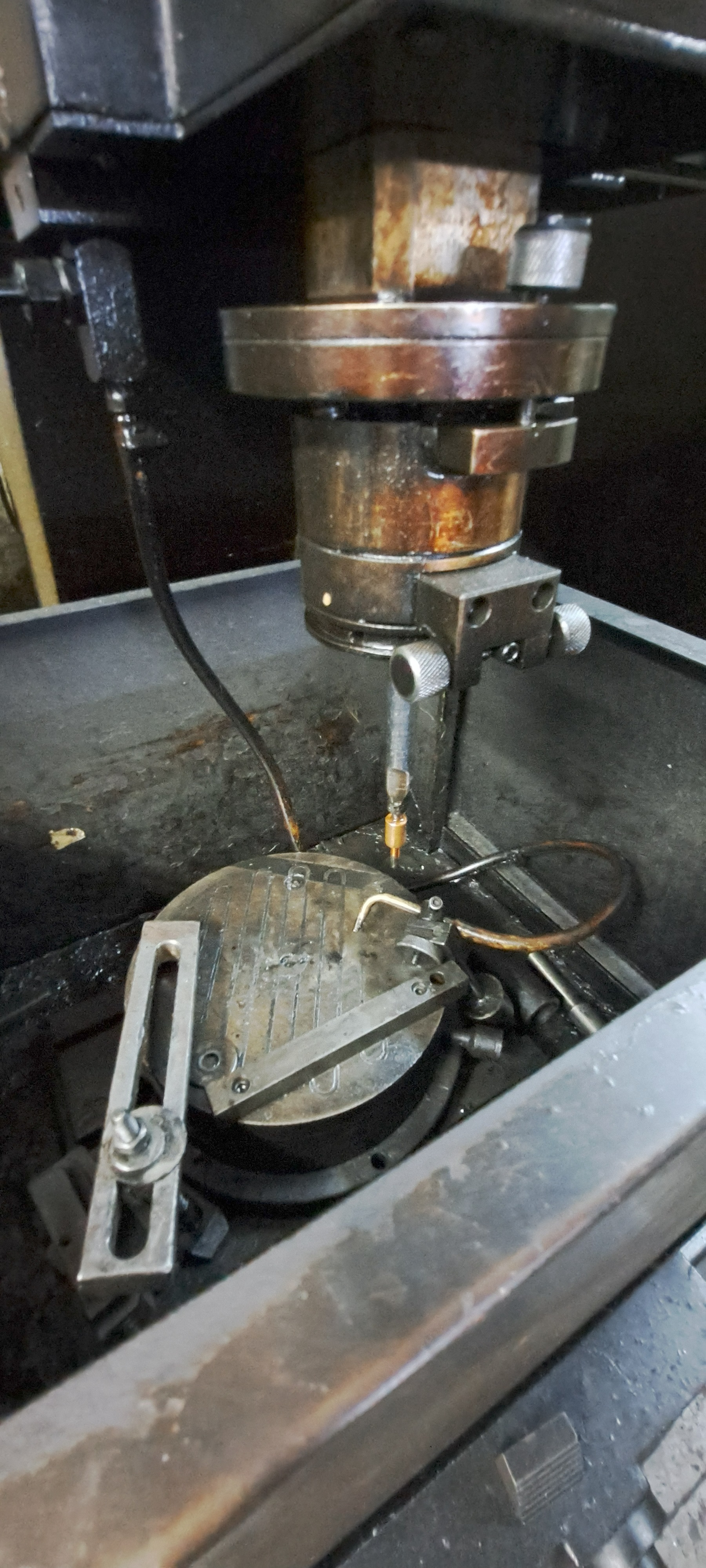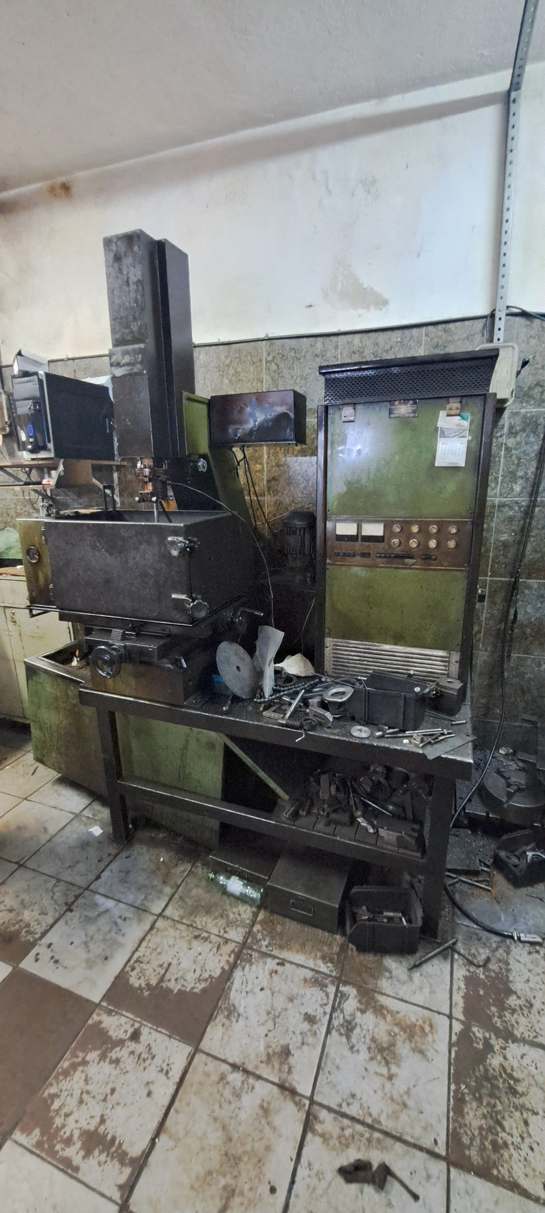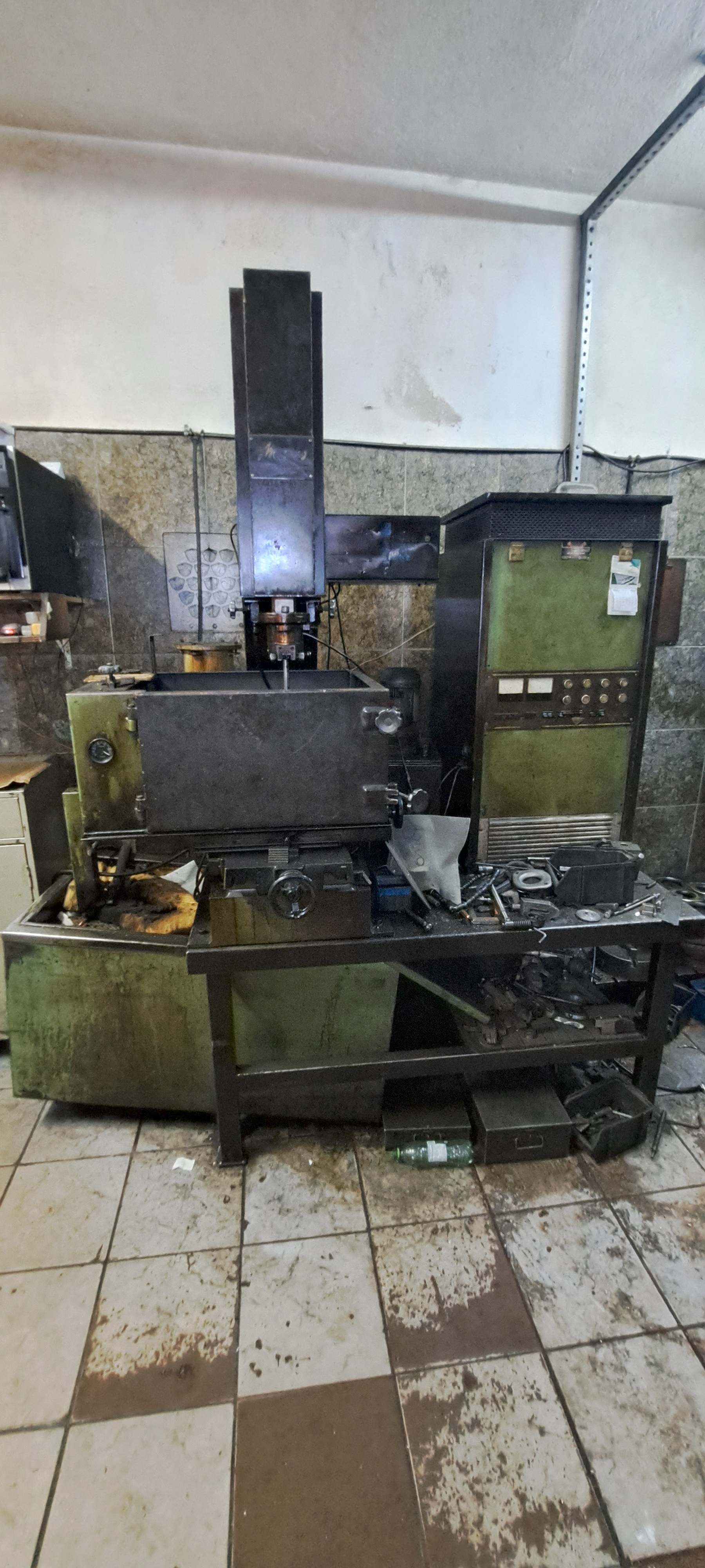 Máquina de eletroerosão por penetração (EDM), modelo antigo, totalmente analógica, usada para usinagem de metais por descargas elétricas, ideal para moldes, matrizes e cavidades complexas.