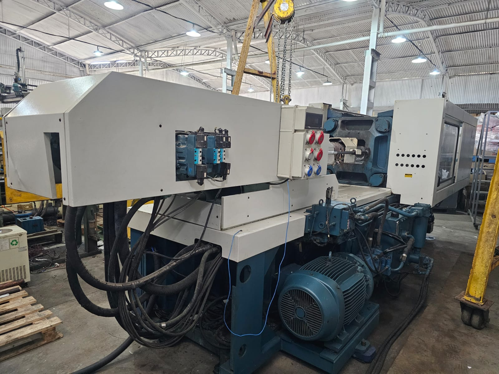 Processamento de materiais termoplásticos por injeção, destinada à fabricação de peças plásticas técnicas, componentes industriais e produtos seriados, com elevada força de fechamento e robustez estrutural.