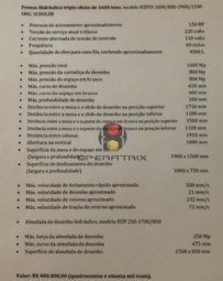 POTENCIA DE ACIONAMENTO; APROX. 150 HP TENSÃO DE SERVIÇO ATUAL TRIFASICA; 220 VOLTS FREQUENCIA; 60 CICLOS QUANTIDADE DE ÓLEO PARA UMA FILA; 4500 LTS MAXIMA PRESSÃO TOTAL; 1600MP MAXIMA PRESSÃO DA CORREDIÇA DO DESENHO; 800MP MAXIMO CURSO DE DESENHO; 650MM MAXIMO CURSO DE ESPAÇO EM BRANCO; 400MM MAXIMA PROFUNDIDADE DE DESENHO; 200MM DIST,ENTRE A MESA E SLIDE DE DESENHO POS.SUP.;1750MM '' INFERIOR ;1100MM DISTANCIA ENTRE COLUNAS; 1910MM ABERTURA NA VERTICAL; 1000MM SUPERFICIE DA MESA E ESPAÇO EM BRANCO;1900MM X 1500MM SUPERF. DE DESLIZAMENTO DO DESENHO; 1000 X 750MM MAX.VELOCIDADE DE FECHAMENTO RAPIDO APROX. ; 300MM /S ALMOFADA DE DESENHO HIDRAULICO MOD,HZP 250 1700/850 SUPERFICIE DA ALMOFADA DE DESENHO; 1700 X 850MM
