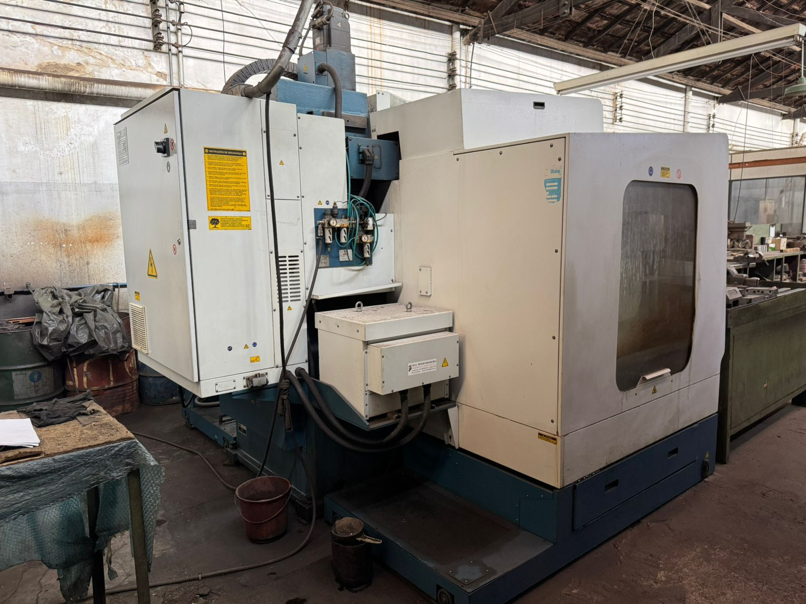 A estrutura é em ferro fundido de alta rigidez, com guias lineares nos eixos e fusos de esferas recirculantes.