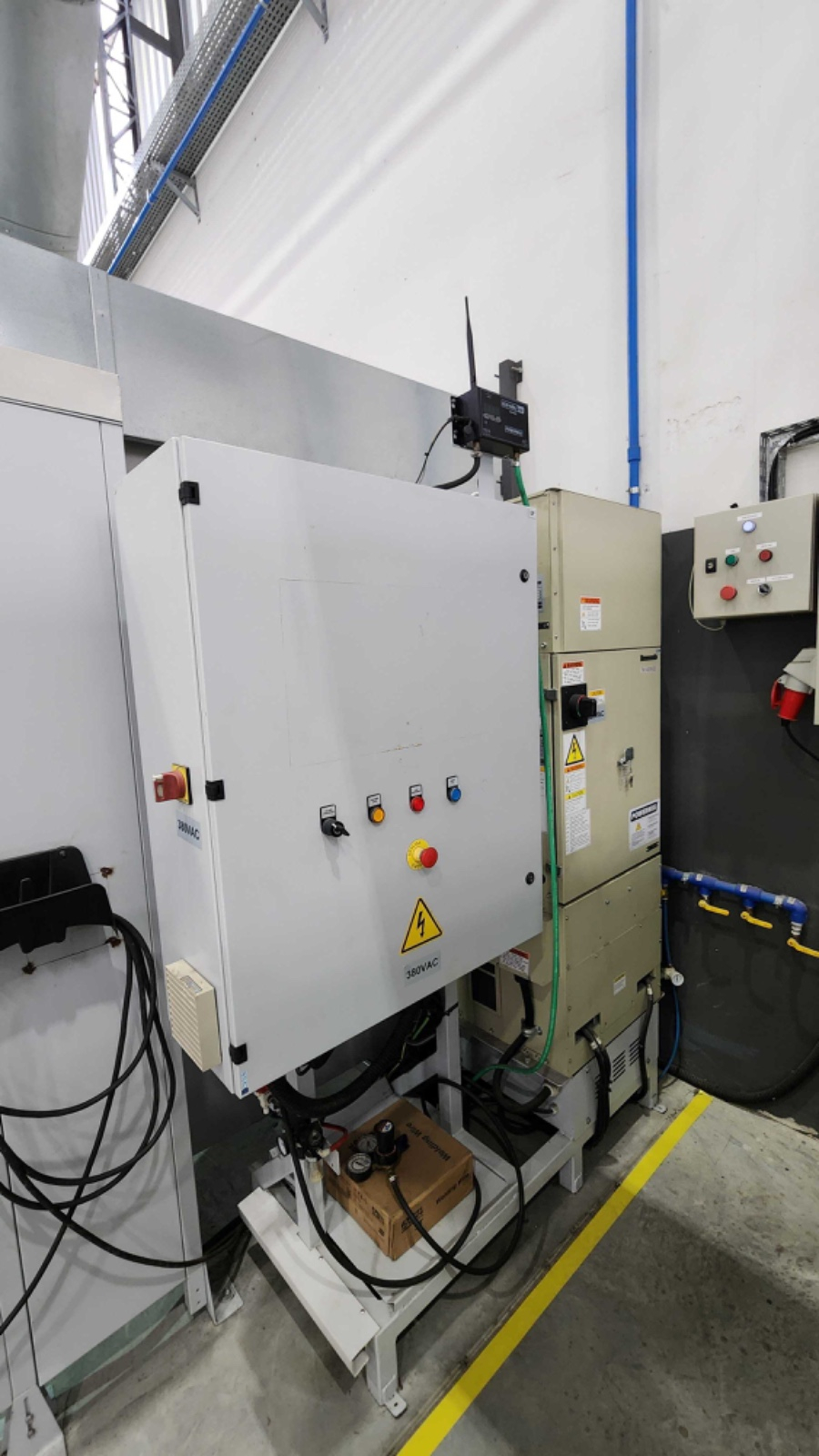 • O Controlador e Fonte de solda Panasonic do tipo TAWERS é conhecida por ser extremamente eficiente e adicionar a maior quantidade de material com o menor aporte térmico, garantindo velocidade da operação e muita estabilidade dimensional para as peças. Estão disponíveis os processos de solda SP-MAG II, Low Pulse, Normal Pulse e HD Pulse, com corrente de soldagem de 30 a 350 amperes. No próprio teach pendant estão disponíveis de forma super simplificada uma calculadora de parâmetros de solda, diferentes opções de oscilação para costura simples, triangular de alta velocidade, côncava em L e em U e também as interpolações PTP, Linear, Circular, Weaving e Circular Weaving.